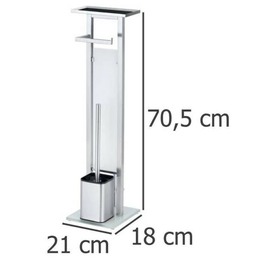 Für kleine Badezimmer wird dieses elegante Toiletten-Set großartig sein. Toilettenpapierständer kombiniert mit Toilettenbürste, Ersatzrollenhalter und praktischer Ablage. Das Set hat Maße 70,5 x 18 x 21 cm (Höhe x Tiefe x Breite). Gestell, Ablage, Bürstenbehälter und Papierhalter sind aus Edelstahl hergestellt, der seidenmatt glänzend ist.