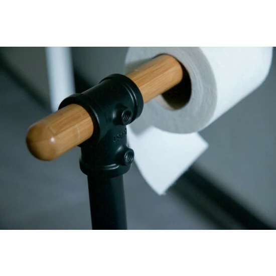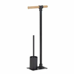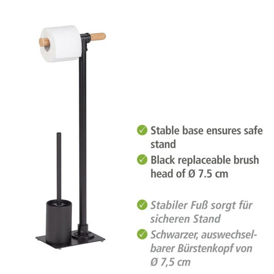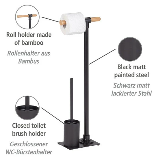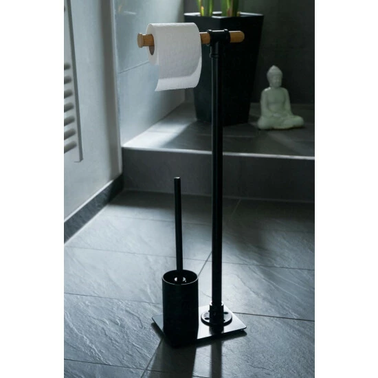 Die extravagante Standgarnitur fügt sich elegant in Ihr bestehendes Badezimmer-Interior ein. Der stabile Fuß des praktischen Badzubehörs sorgt für einen sicheren Stand. Die sich darauf befindende Rollenhalterung ist aus schwarz lackiertem Stahl und nachhaltigem Bambus gefertigt. Bambus punktet mit hohen Erträgen und niedriger Umweltbelastung und liegt daher absolut im Trend. Der nachwachsende Rohstoff verleiht Ihrem Bad unverzüglich ein warmes und natürliches Ambiente! Unterhalb des WC-Papier Rollenhalters befindet sich der geschlossene, schwarze Bürstenhalter. Dieser besticht – wie auch der Standfuß – in einem mattierten Finish.