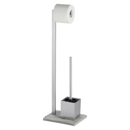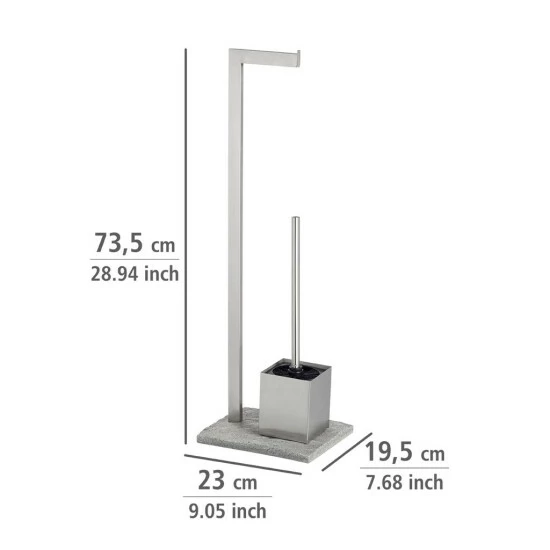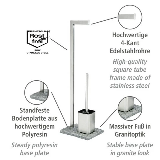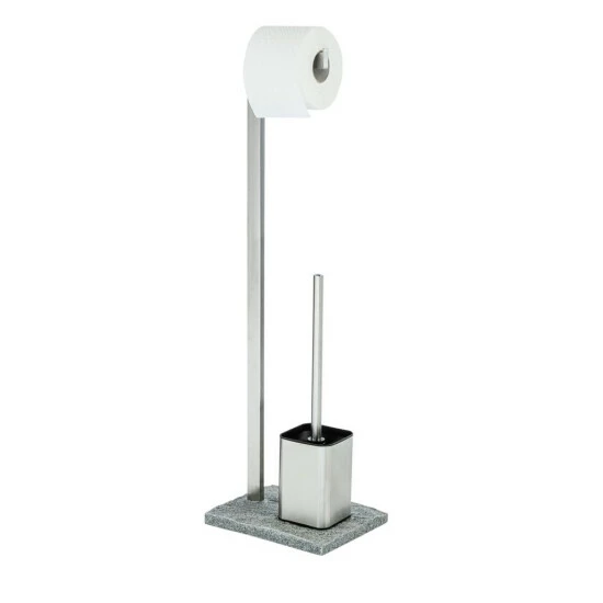 Wenko Granit Toilettenpapierhalter mit Bürstenhalter Ein praktischer Halter für eine Toilettenbürste und eine Toilettenpapierrolle von Wenko. Der Halter ist ein stilvolles Attribut für das Badezimmer oder die Toilette. Spezifikationen: Farbe: silber Material: Granit, Edelstahl Gewicht: 2,1 kg Abmessungen: 23 x 19,5 x 73,5 cm Inhalt: 1 Halterung 1 Toilettenbürste