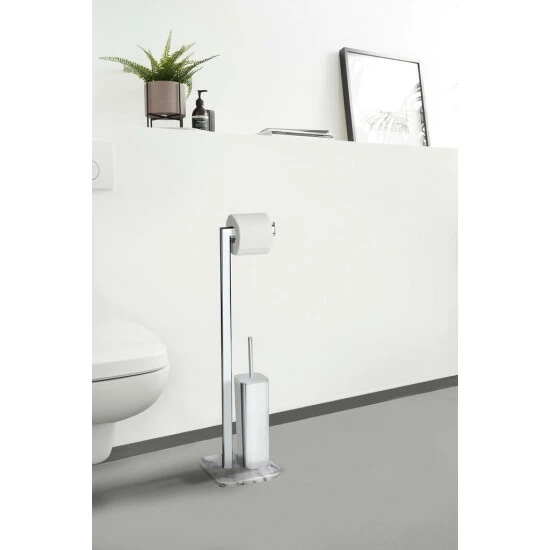 Der elegante, freistehende Badezimmerständer ONYX kombiniert einen Toilettenpapierhalter und einen geschlossenen Toilettenbürstenhalter. Das minimalistische, aber elegante Design passt perfekt in moderne und nicht-moderne Badezimmer. Es verleiht jedem Bad einen eleganten Charakter und hält Papier und Bürste an einem leicht zugänglichen Ort.