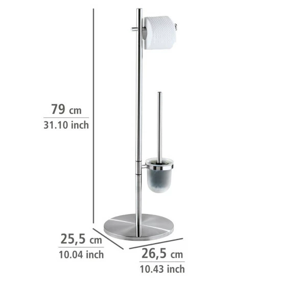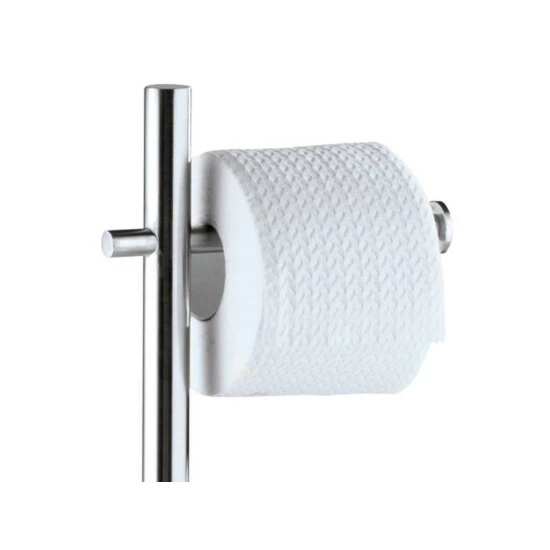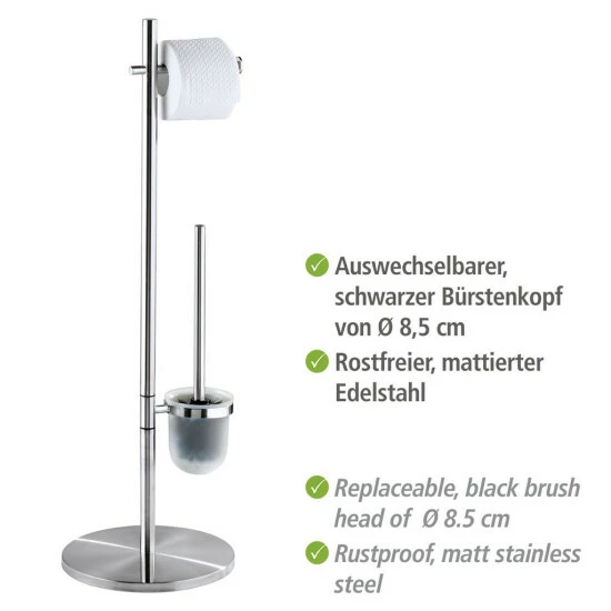 Die Stand WC-Garnitur Pieno ist eine 2 in 1 Kombination aus offenem Toilettenpapierrollen- und WC-Bürstenhalter. Sie ist freistehend und verfügt über eine schwere Bodenplatte, die für sicheren Stand sorgt.