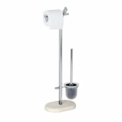 Die flexibel aufzustellende Standgarnitur trägt die WC-Papierrolle in angenehmer Höhe sowie die WC-Bürste in einem eleganten, hochwertigen Glaseinsatz. Die im Lieferumfang enthaltene Bürste ist mit einem schwarzen, auswechselbaren Bürstenkopf von Ø 7,5 cm versehen. Mit dieser praktischen WC-Bürste kann das WC gründlich gereinigt werden.