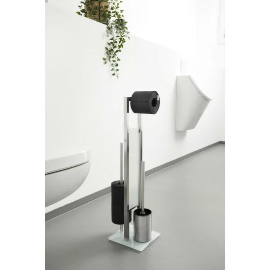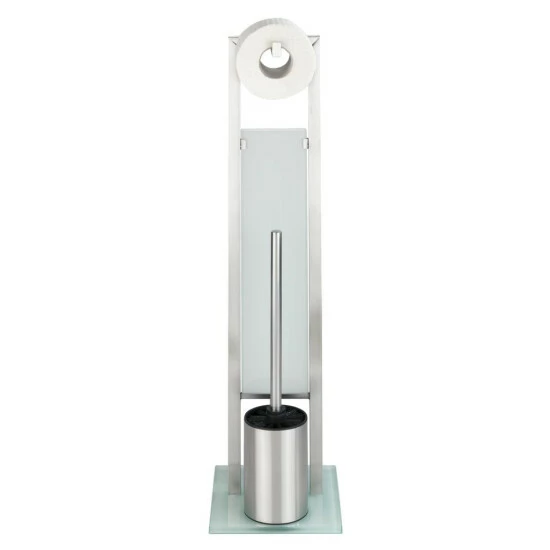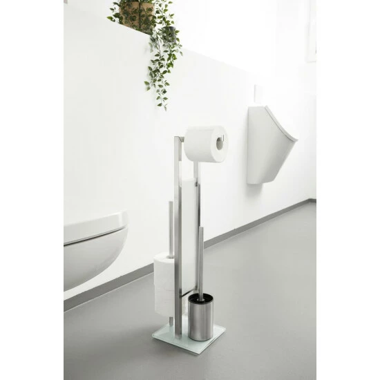 Die hochwertige Stand WC-Garnitur Rivalta aus rostfreiem, mattiertem Edelstahl kombiniert mit weißem, gehärtetem Glas setzt dekorative Design-Akzente im Badezimmer.