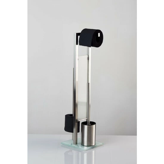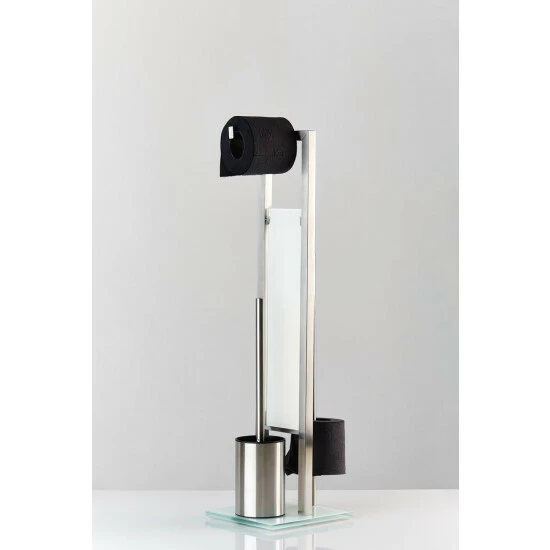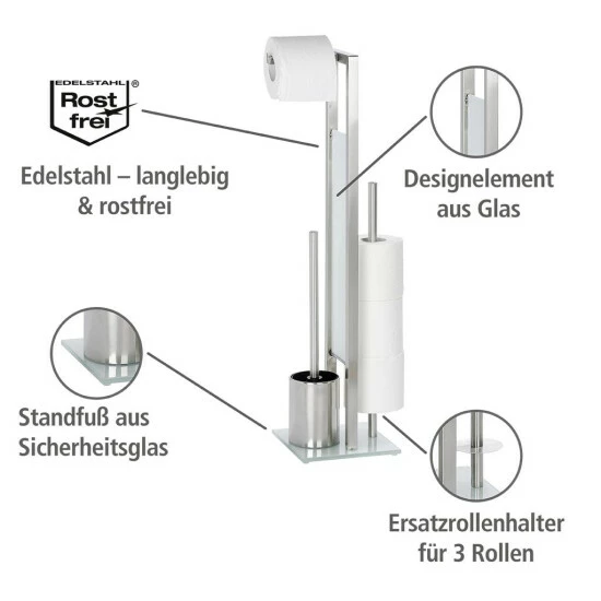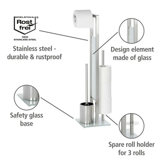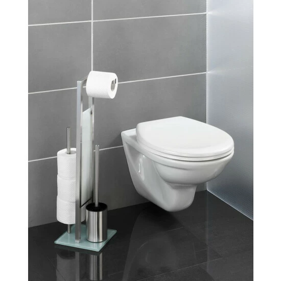 Sie ist eine praktische 3 in 1 Kombination bestehend aus einem offenen WC-Bürstenhalter, einem offenem Toilettenpapierrollenhalter für die sofortige Entnahme und einem separaten Ersatzrollenhalter für die Aufbewahrung von bis zu 3 weiteren Rollen.