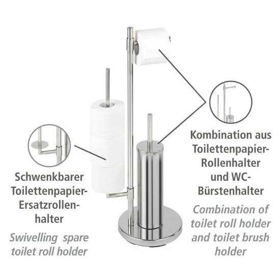 Sind Sie gerade auf der Suche nach einer Möglichkeit das Bad noch ein wenig schöner zu gestalten? Dann ist die Stand WC-Garnitur Universalo Neo von WENKO genau das Richtige für Sie. Es handelt sich hierbei um eine clevere 3in1 Kombination aus WC-Garnitur, Toilettenpapierhalter und schwenkbarem Toilettenpapier-Ersatzrollenhalter.