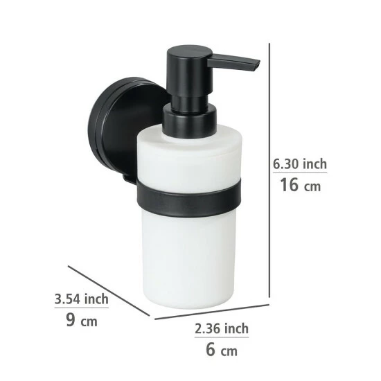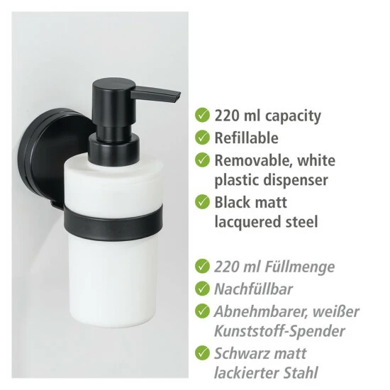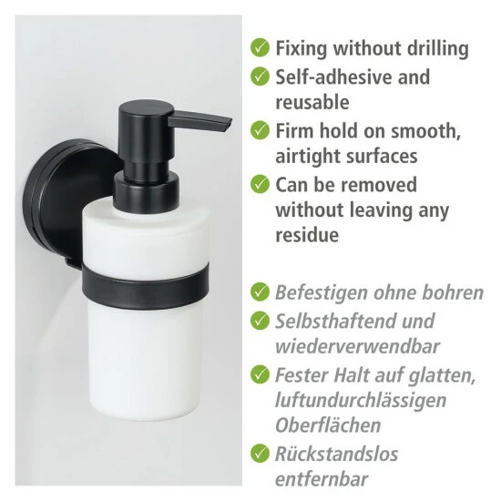 Innovativ und trendig, so setzt der Seifenspender von WENKO Akzente in jeden Haushalt. Der Static-Loc® Plus Seifendosierer haftet durch statische Aufladung und bietet starken Halt auf glatten luftundurchlässigen Oberflächen (wie z.B. Fliesen, Glas, folierte Holzplatten), ganz ohne schrauben und bohren!