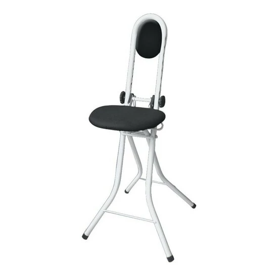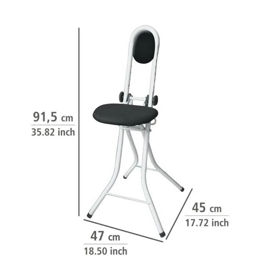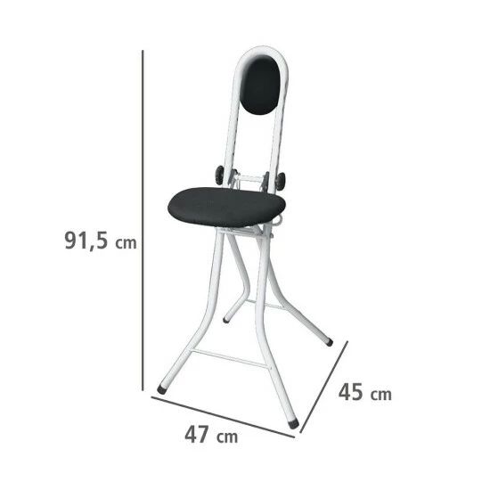 Praktischer Helfer beim Bügeln · für Küche und Arbeitszimmer. Optimale Stehhilfe beim Bügeln und allen zeitintensiven Arbeiten im Stehen. Standfestes Gestell mit gepolsterter Rückenlehne. Sitzhöhe lässt sich unterschiedlichen Körpergrößen anpassen. Mit Feststellvorrichtung · damit der Stuhl sicher stehen bleibt. Abnehmbarer Sitzbezug mit praktischen WENKO-Clip.