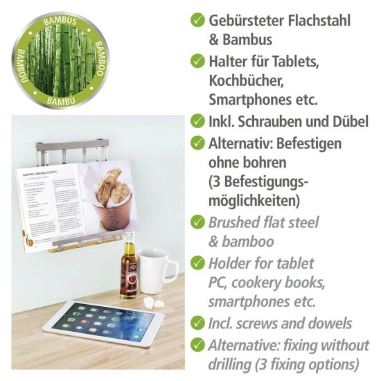 Wenko tablettenhalter Mit diesem Tablettenhalter haben Sie Ihre Tablette oder Ihr Kochbuch immer griffbereit. Der Halter ist aus hochwertigem Aluminium und Holz gefertigt und kann an der Wand aufgehängt werden. Spezifikationen: Farbe: silber, natur Material: Aluminium, Holz Abmessungen: 7,5 x 19 x 23 cm (B x H x T)