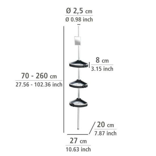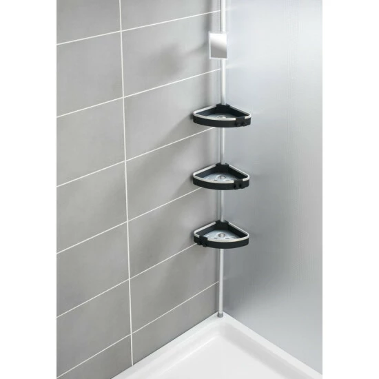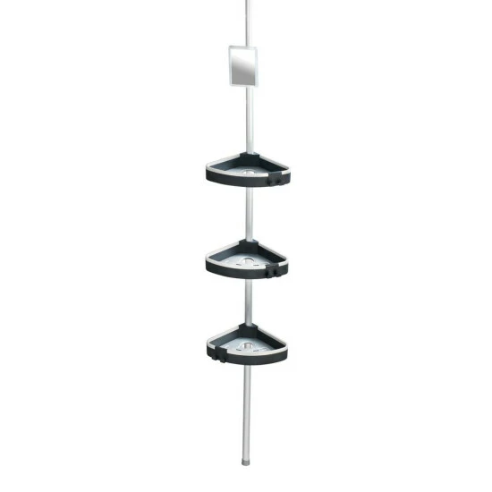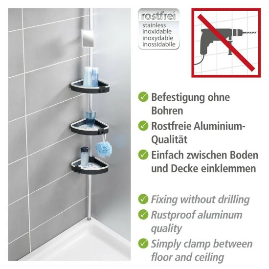 Dieses stilvolle Eckregal von Wenko bietet ideale Ablage- und Aufhängemöglichkeiten für Badutensilien. Für den universellen Einsatz in der Duschkabine oder im Bad. Das Gestell besteht aus einer Teleskopstange, drei Behältern und einem Anti-Kondensations-Spiegel. Dank der verstellbaren Stange ist ein Bohren in die Wand nicht notwendig.