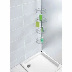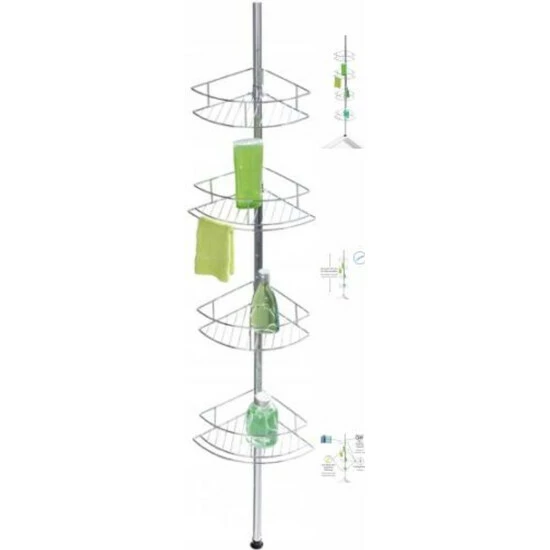 Das praktische Eckregal aus rostfreiem Edelstahl bietet mit vier Drahtkörbchen zahlreiche Abstellmöglichkeiten für Shampoo, Duschbad, Seife, Schwamm und andere Badeutensilien. Zwei Körbe haben eine zusätzliche Halterung, um Waschlappen, etc. einzuhängen.