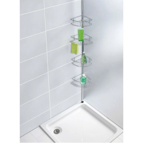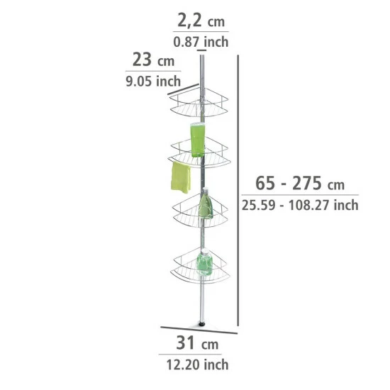- Schnell und einfach montiert: Nie wieder bohren und schrauben – das Badezimmer-Regal von WENKO ist im Handumdrehen montiert, einfach zwischen Boden und Decke klemmen und fertig! Lieferumfang: Duschregal für die Ecke, 4 x Duschablagekörbchen, davon 2 mit Halterung, Die Teleskopstange ist aus massiver Qualität und hat einen Rohrdurchmesser von 22 mm, Maße (B x H x T): 31 x 65 -275 x 23 cm, Höhe Körbe 7 cm