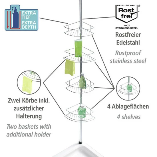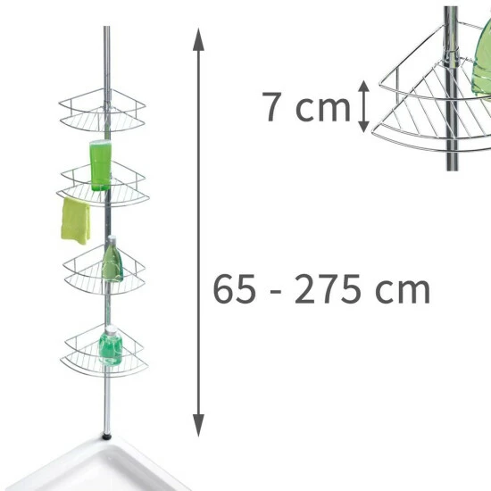 - Flexibilität im Badezimmer: Das dekorative Duscheckregal ohne Bohren von WENKO ist durch die von 65 bis 275 cm höhenverstellbare Edelstahl-Teleskopstange universell in Bad und Dusche einsetzbar