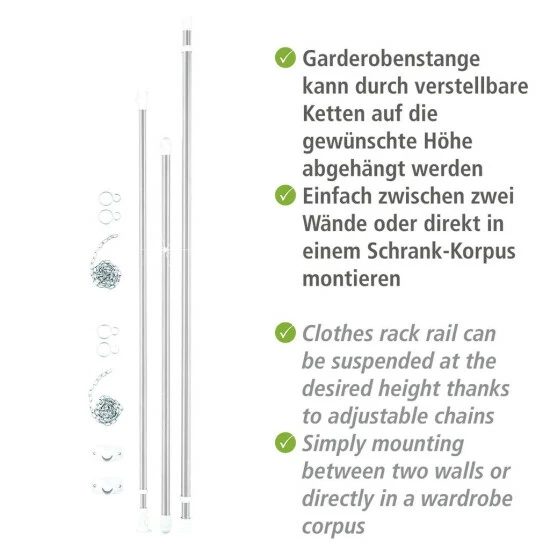 Das Garderoben-Set bietet viel Platz für Kleider, Mäntel, Oberteile, Hosen, Blusen oder Hemden. Es ist in der Breite teleskopisch von ca 150 bis ca 250 cm ausziehbar und wird zwischen zwei Wände oder direkt in einem Schrank-Korpus montiert.