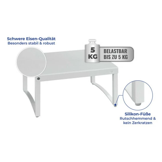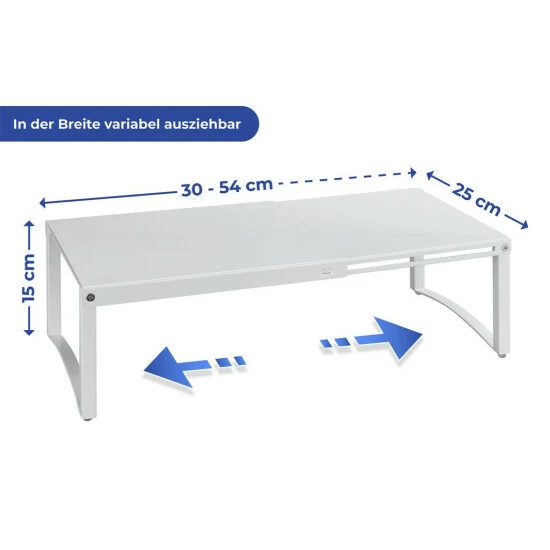 Der platzsparende Schrankeinsatz kann bis zu 5 kg belasten werden und ist ausziehbar von 30 bis 54 cm Breite. Damit die Regal-Oberflächen der Küchenschränke nicht zerkratzt werden, ist die Schrankeinlage mit runden, rutschhemmenden Silikon-Füßen versehen.