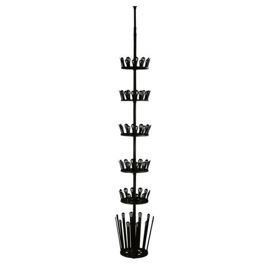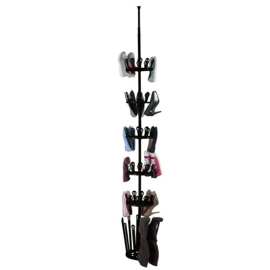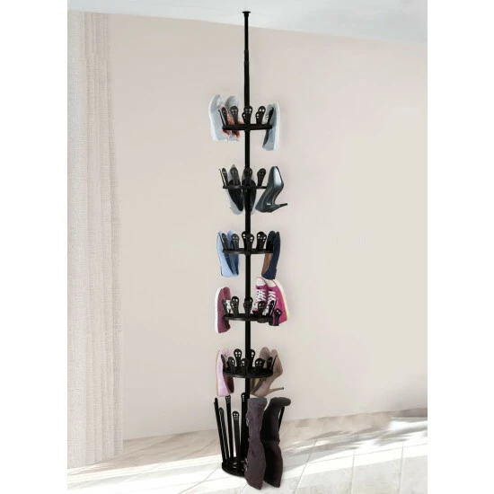 Endlich keine herumfliegenden Schuhe mehr im Flur, über die man leicht stolpern kann, keine wild gestapelten Schuhe unter einem Bänkchen oder in einem Regal, das überquillt. Dieses Teleskop-Schuhregal hat nur einen Bodendurchmesser von 30 cm, denn alle Ihre Schuhe werden jetzt bis zur Decke sortiert. Sie können den Teleskopstab aus Metall bis zu drei Meter hoch ausfahren und ihn an der Zimmerdecke fixieren. Fünf kleine, drehbare Tableaus mit Kunststoffhaltern sitzen um die Stange herum. Unten sind 12 lange Halter, über die Sie Stiefel hängen können. Sie bauen das innovative Schuhregal auch ganz einfach ohne Werkzeug und Bohren auf. Drehen Sie am Schluss die Teleskopstange so weit heraus, dass sie stabil unter der Decke hält – genau wie bei den variabel verstellbaren Vorhangstangen. Das schwarze Regal kann übrigens auch sehr gut in einem Ankleidezimmer oder im Keller aufgestellt werden. Das Schuhregal eignet sich ideal für Familien und natürlich für alle Schuhsammlerinnen und Schuhliebhaber.