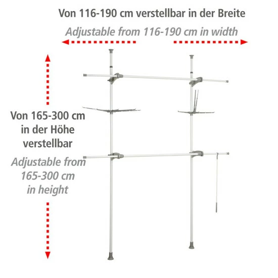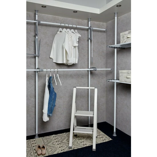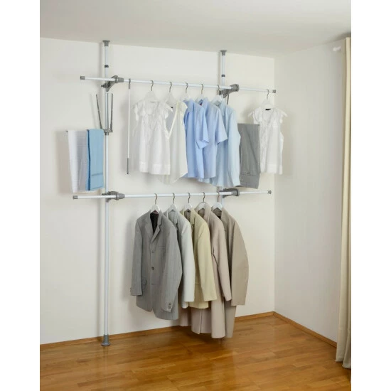 Die Trägerstangen lassen sich in der Höhe von 165-300 cm teleskopisch ausziehen. In der Breite ist das System von 116-190 cm an den Raum anpassbar. Zudem können die Lieblingskleidungsstücke ganz einfach mit dem Kleiderhaken eingehängt oder abgenommen werden. So können auch höher hängende Kleidungsstücke einfach und schnell erreicht werden. Das Teleskop-System kann besonders nah an der Wand angebracht werden, wodurch der Raum bestmöglich ausgenutzt wird. Jede Querstange ist mit 20 kg belastbar.