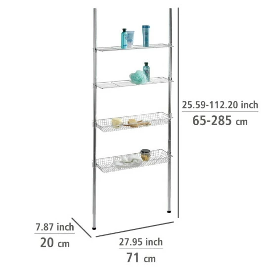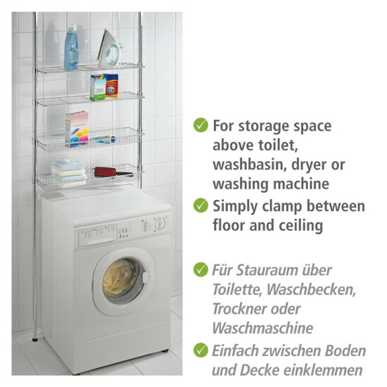 Bestehend aus: 2x Drahtkörben, 2x Drahtböden und 2x Teleskopstangen. Ausziehbar bis max. 306 cm. Hohe Stabilität, hohe Belastbarkeit. Zum Überbauen von Waschmaschinen oder Toiletten geeignet.
