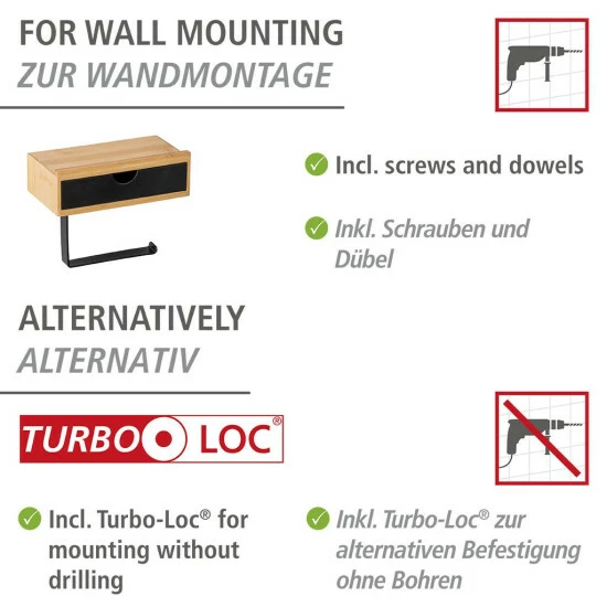 Lieferumfang: WC-Papier Ersatzrollenhalter Bambusa mit Ablage und schwarzer Schublade, aus hochwertigem Bambus, (B x H x T): 18,5 x 14 x 10,5 cm, zur Wandmontage, inklusive Befestigungsmaterial.
