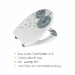Der exklusive WC-Sitz Astera von WENKO zeichnet sich durch eine ovale Formgebung aus und bringt mit dem schönen Pusteblumen-Design florale Eleganz ins heimische Badezimmer und Gäste-WC.