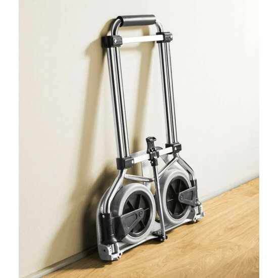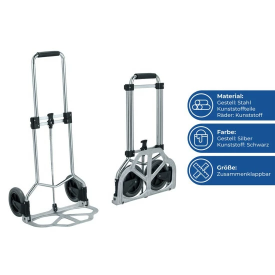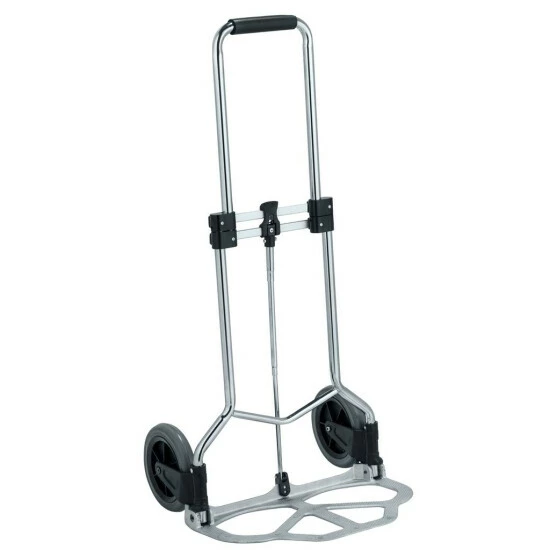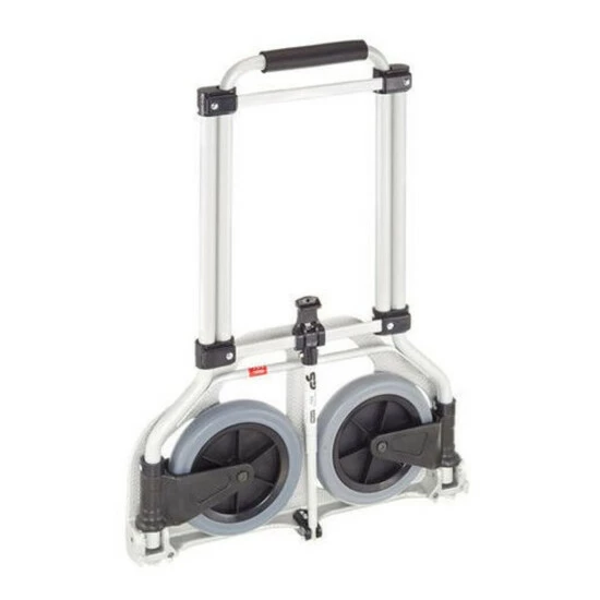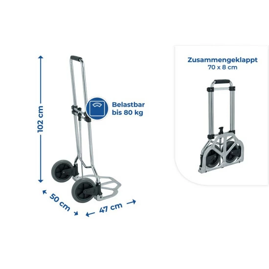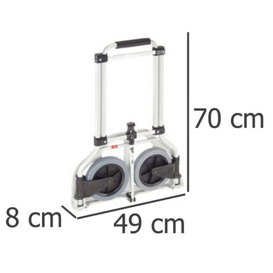 Der praktische Transportkarren ist aus leichtem Aluminium und Kunststoff (Gewicht ca. 3 kg) gefertigt. Seinem Namen entsprechend ist er flach zusammenfaltbar und passt so in jede Nische und jeden Kofferraum. Maße (B x H x T): aufgebaut – 50 x 102 x 47 cm / zusammengeklappt – 49 x 70 x 8 cm