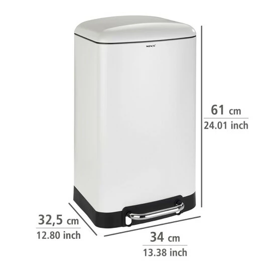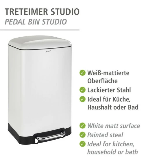 Der hochwertige und trendige Treteimer aus der Serie Studio ist aus lackiertem Stahl hergestellt. Die weiß-mattierte Oberfläche und die schöne Form verleihen dem Abfalleimer eine edle Optik. Ausgestattet mit der WENKO Easy-Close-Absenkautomatik schließt der Deckel ganz sanft und leise ohne lautes Aufknallen.