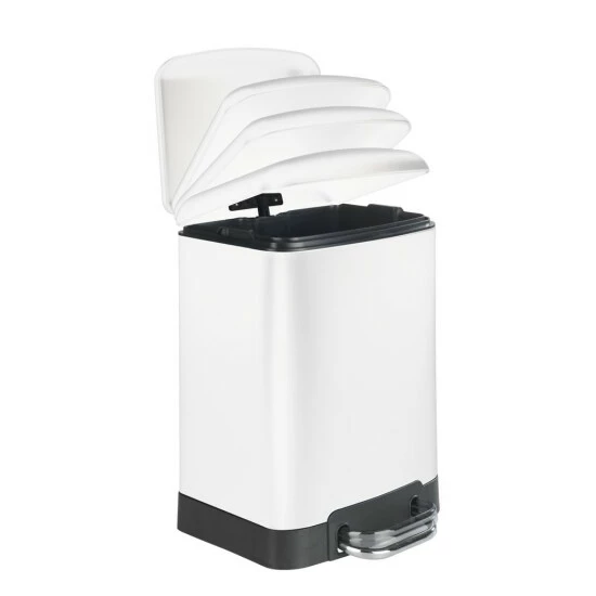Der edle Treteimer Studio Weiß ist aus hochwertigem, lackiertem Stahl hergestellt. Die weiß-mattierte Oberfläche und die schöne Form verleihen dem Abfalleimer eine elegante Optik. Ausgestattet mit der WENKO Easy-Close-Absenkautomatik schließt der Deckel ganz sanft und leise ohne lautes Aufknallen.