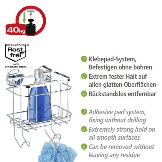 Hoher Korb für sicheren Stand der Badutensilien. Aus hochwertigem Edelstahl. Sicherer Halt durch Turbo-Loc* Klebetechnik. Schutzfolie abziehen und anbringen. Schnelle und einfache Montage ohne Werkzeug und ohne bohren. Rückstandslos entfernbar.
