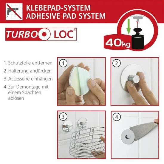 Die Befestigung ist kinderleicht. Die Turbo-Loc® Wandbefestigung ist ein Klebesystem mit extrem festem Halt auf allen glatten Oberflächen. Einfach die Schutzfolie des Klebepads entfernen, die Halterung an der gewünschten Stelle fixieren und anpressen. Dann nur noch das Accessoire einhängen. Das Klebepad ist rückstandslos wieder entfernbar. Durch das Spezial-Klebepad System sind die Befestigungshaken jeweils dauerhaft mit einer Zugkraft bis zu 40 kg belastbar.