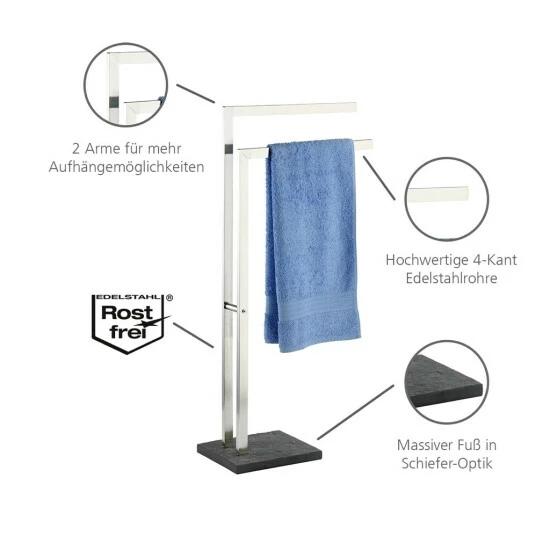 Der WENKO Handtuchhalter Slate Rock ist ein echtes Must Have für den Haushalt. Durch seine optimal angeordneten Arme, sorgt der praktische Helfer dafür, dass alles seinen geordneten Platz findet. Egal ob Handtücher, Duschtücher, Badematten, Kleidung oder Textilien. Des Weiteren verfügen die Stangen über einen perfekten Abstand zueinander. So kann die Luft zwischen den Textilien optimal zirkulieren, was nicht nur dafür sorgt, dass schlechte Gerüche vermieden werden, sondern auch dafür, dass Kleidung oder Handtücher schneller trocken.