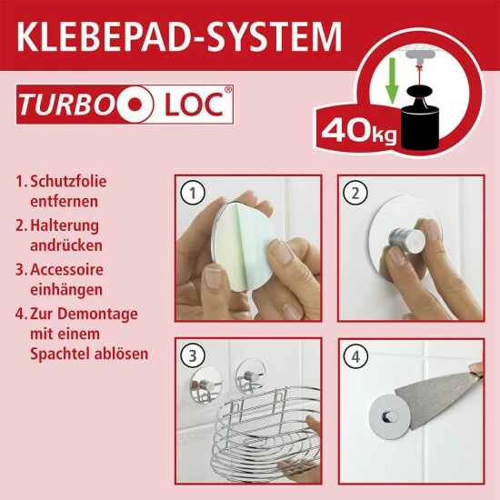 Die Turbo-Loc® Wandbefestigung ist ein Klebesystem mit extrem festem Halt auf allen glatten Oberflächen. Einfach die Schutzfolie der beiden Klebepads entfernen, die Halterung an der gewünschten Stelle fixieren und anpressen.
