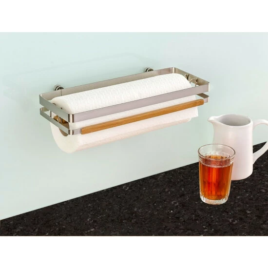 Im Premium Küchenrollenhalter aus hochwertigem, gebürstetem Flachstahl erhält die Papiertuchrolle einen festen Platz. An der Wand hängend mit stilvoller Bambus-Applikation werden die Papiertücher nicht feucht und sind leicht ab zu reißen. In den Küchenrollenhalter passen alle handelsüblichen Küchenrollen.