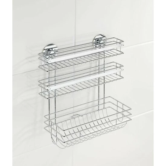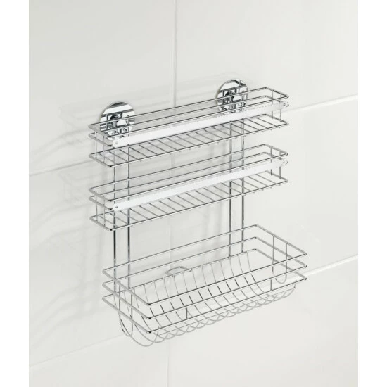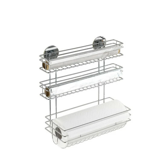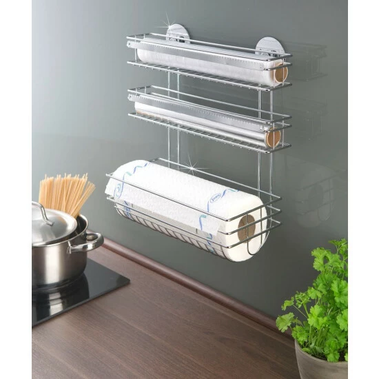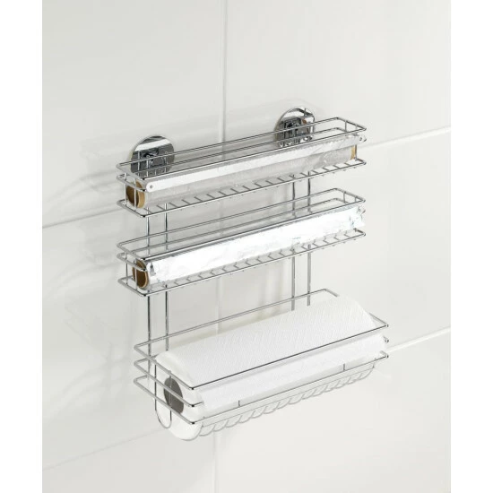 Im Turbo-Loc® Küchenrollenhalter Trio aus verchromtem, hochglanzpoliertem Stahl erhalten verschiedenste Küchenrollen, ob Papiertücher, Alu- oder Frischhaltefolie ihren festen Platz. An der Wand hängend werden die Papiertücher nicht feucht.