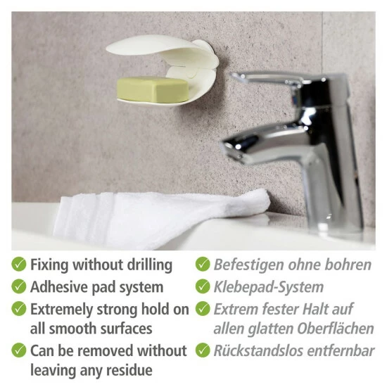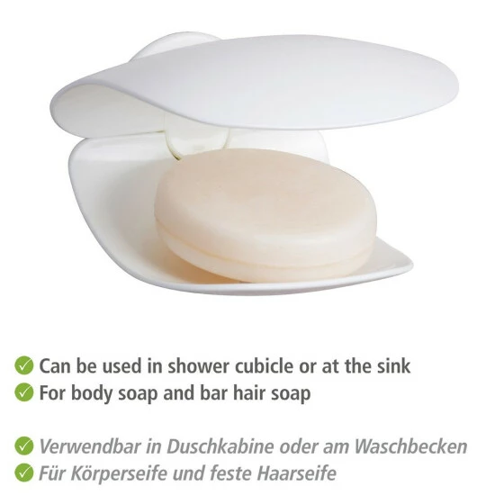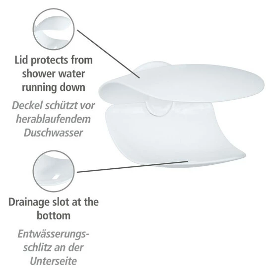 Die Seifenablage überzeugt dank eines durchdachten Designs: Der anwendungsorientierte Deckel schützt die Stückseife vor herablaufendem Duschwasser. Der Entwässerungsschlitz an der Unterseite des Seifenbehälter ermöglicht das einfache Abtropfen des Wassers. Durch den abnehmbaren Deckels ist zudem eine schnelle und einfache Reinigung gesichert. Sowohl fester Körperseife als auch fester Haarseife bietet die Ablage in der Dusche oder der Badewanne eine geborgene Ablagefläche. Das aus Kunststoff hergestellte Badutensil für verpackungsfreie Seife eignet sich auch als Seifenablage am Waschbecken.
