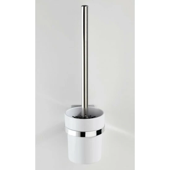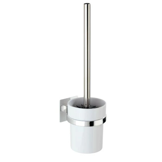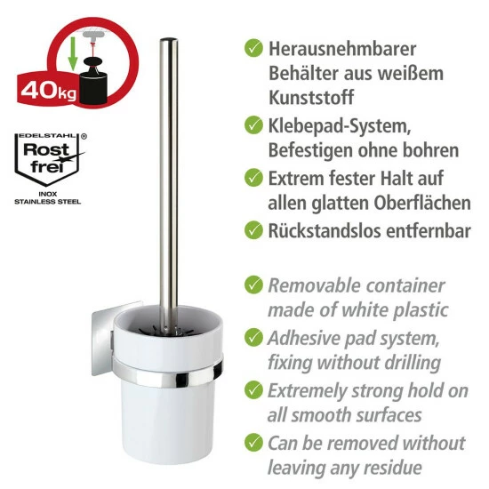 Der praktische WC-Bürstenhalter ist aus stabilem, weißem Kunststoff gefertigt und kann ganz einfach aus dem Haltering aus verchromten Kunststoff herausgenommen werden. Dabei ist die Bürste besonders hygienisch, denn durch den Anti-Haft-Effekt der Silikonborsten werden Schmutz und Toilettenpapierreste einfach weggespült. Die Bürste mit rostfreiem Edelstahl-Stiel und schwarzem, auswechselbarem Bürstenkopf (Ø 7,5 cm) ist im Lieferumfang enthalten.