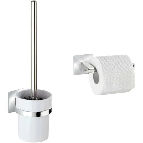 WENKO Turbo-Loc® WC-Garnitur Quadro – WC-Bürstenhalter, 9.5 x 35.5 x 12 cm, Chrom & Turbo-Loc® Edelstahl Toilettenpapierhalter ohne Deckel Quadro Edelstahl rostfrei, 16.5 x 6.5 x 7 cm, Chrom