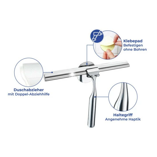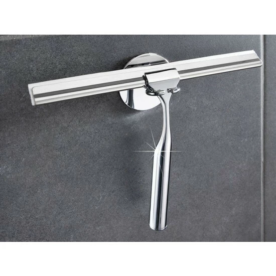 Der Duschabzieher mit dem praktischen Halter ist nun sofort griffbereit.