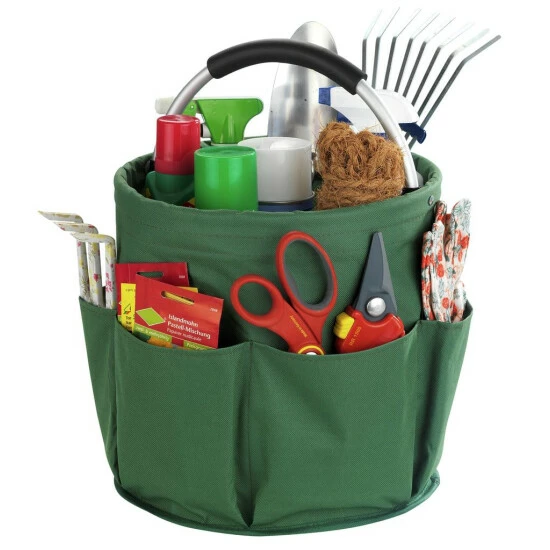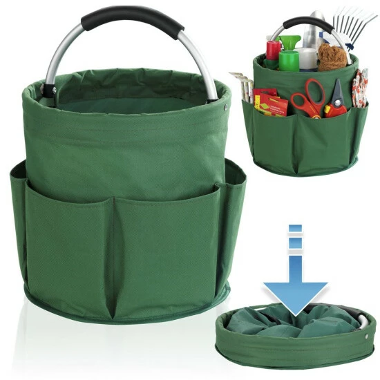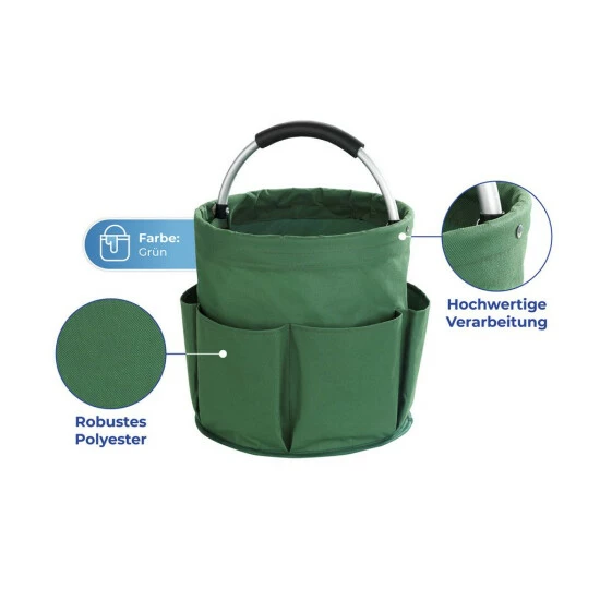 Der Universal-Caddy verfügt über ein großes Hauptfach und sechs Außentaschen zum Verstauen aller Gartenwerkzeuge. Bei Nichtbenutzung kann der Korb platzsparend zusammengefaltet werden. Durch den gepolsterten Alu-Tragegriff ist ein bequemer Transport gesichert. Der Reinigungs-Caddy ist aus unempfindlichen Polyester gefertigt.