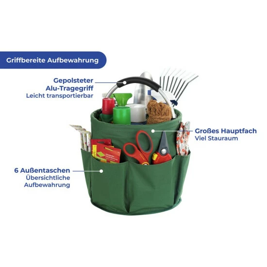 - Ein großes Hauptfach & 6 Außentaschen zum Verstauen von Gartengeräten, Handschuhen, etc.