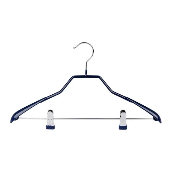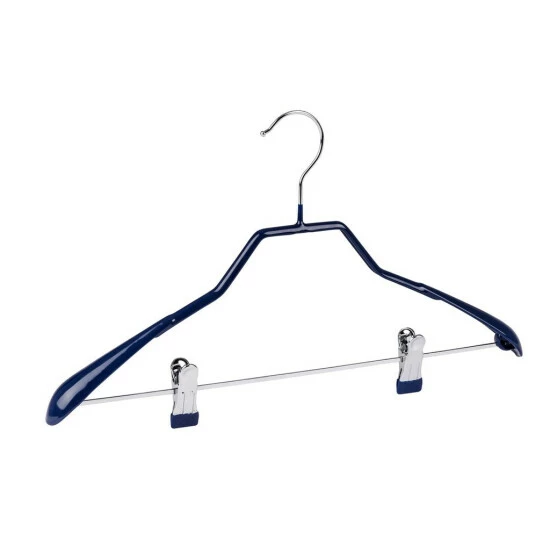 Der praktische Kleiderbügel aus Metall verfügt über einen Hosensteg sowie zwei individuell einstellbaren Clips. Diese geben sowohl Hosen als auch Röcken besonders guten Halt. Der Kombibügel ist rutschhemmend mit dunkelblauem Kunststoff ummantelt.