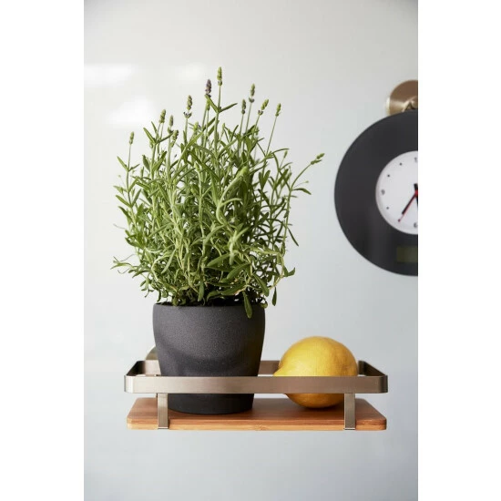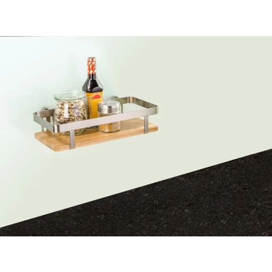 Universal-Küchenregal aus Nickel-Stahl mit Bambuselementen. Es ist ideal zum Aufbewahren von Gewürzen, Kräutern, Gläsern usw. An der Wand aufgehängt, ermöglicht es einen schnellen Zugriff auf die notwendigen Produkte und hilft, Ordnung zu halten. Das Set enthält Stifte und Schrauben, mit denen das Regal montiert werden kann. Eine alternative Montageart ohne Bohren sind Vakuum-Loc-, Turbo-Loc- oder Static-Loc-Systeme.