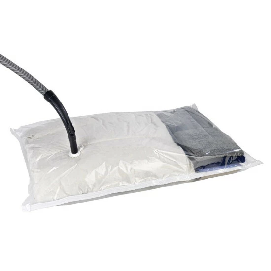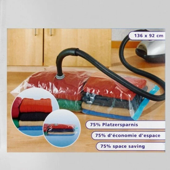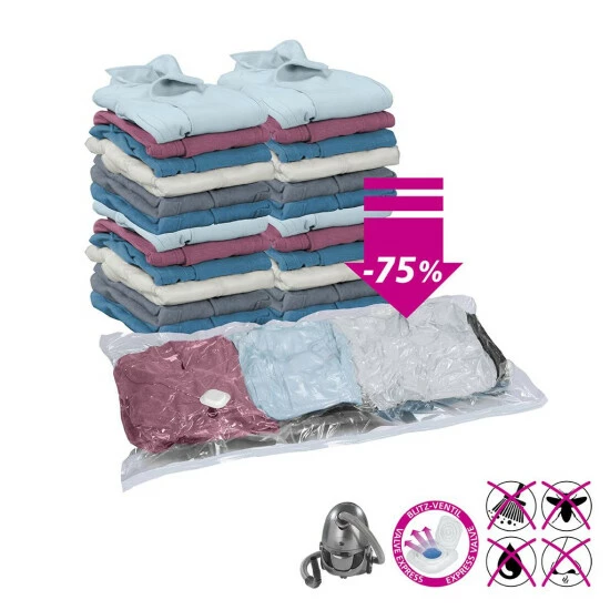 Platzsparwunder. Einfach mit Hilfe des Staubsaugers Vakuum erzeugen und bis zu 75% Platz sparen. Die Kleidung hat nach Gebrauch wieder das ursprüngliche Volumen.