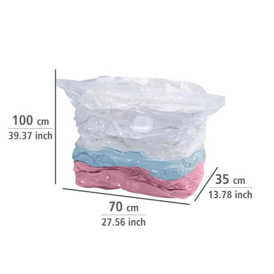 - Lieferumfang: Vakuum-Beutel in Größe L, zur platzsparenden Kleider-Aufbewahrung, auch auf Reisen. Mit Blitz-Ventil für den Staubsauger und Zipper-Gleitverschluss, Maße (B x H x T): 70 x 100 x 35 cm.