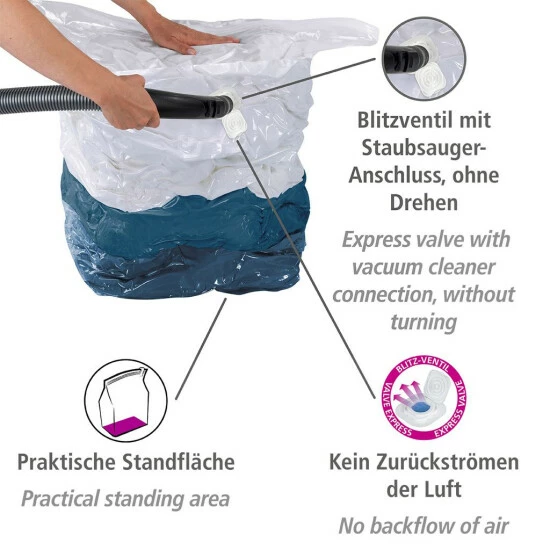 Kinderleichte Anwendung: Einfach die Kleidung in den Beutel füllen, den Luftdichten Zip-Verschluss schließen und die Luft mit Hilfe des Staubsaugers durch das Blitz-Ventil absaugen. Das Ventil verhindert dabei das zurückströmen der Luft und der Inhalt ist zuverlässig und luftdicht verschlossen.