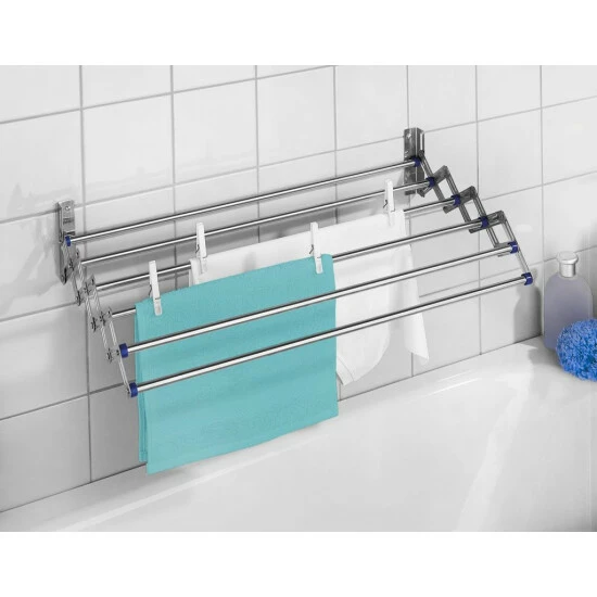Der platzsparende, ausziehbare Teleskop-Wäschetrockner passt mit einer Breite von 70 cm auch in das kleinste Bad. Die fünf ausziehbaren Trockenstäbe bieten eine Gesamttrockenlänge von 3,3 m. Bei Nichtgebrauch kann der Wäschetrockner platzsparend zusammengeklappt werden.