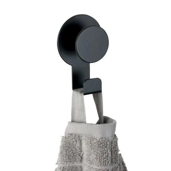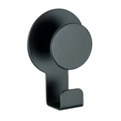 Der praktische Klebehaken ist aus rostfreiem Edelstahl in schwerer, massiver Qualität gefertigt und liegt mit seiner matt-schwarzen Oberfläche absolut im Trend.