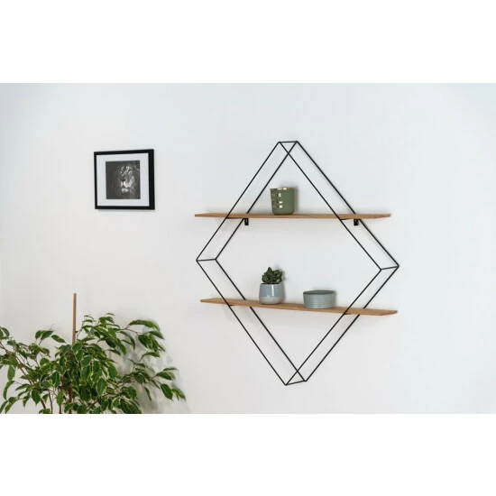 Das Wandregal Geo kombiniert in höchstem Maße praktische Funktion mit elegantem Design. Das komfortable Regal bietet auf raffinierte Weise das perfekte Gleichgewicht zwischen Praktikabilität und Ästhetik. Der Ordnungshelfer kann schnell und einfach mit Schrauben an der Wand befestigt werden. Das großzügige Regal mit Metallrahmen in Form einer Raute stellt auf zwei Regalbrettern aus Holz offene Fläche für Dekoration, kleine Pflanzen und Alltagsgegenstände bereit.