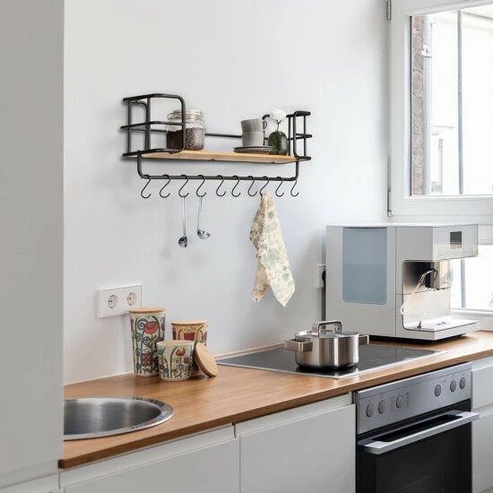 Das moderne Wandregal Loft bietet mit seinem Bambusboden Platz für Handtücher, Bücher, Küchenutensilien, Accessoires und Dekoration. Egal, wo Sie das angesagte Haushalts- und Badregal platzieren, ob im Bad, Schlafzimmer, Flur, in der Küche oder im Wohnzimmer – das praktische Regal ist immer ein Blickfang und vielseitig einsetzbar. An der stilvollen, schwarzen Aufhänge-Stange können zusätzlich die 10 Haken platziert werden, die so weitere Tücher, Scheren, etc. immer griffbereit halten. Das Befestigungsmaterial für die Wandmontage ist im Lieferumfang enthalten.