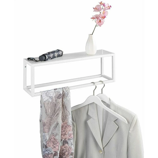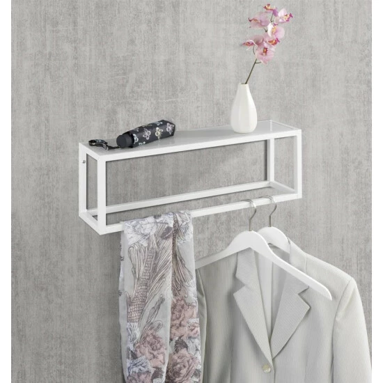 Auch in der Garderobe oder im Schlafzimmer macht das elegante Regal eine gute Figur. Denn auf der schönen Glasablage finden auch Handtaschen, Schirme und Blümchen einen hübschen Platz. An der Stange können ebenso Bügel mit Jacken, Blusen, Mäntel oder auch Tücher aufgehängt werden.