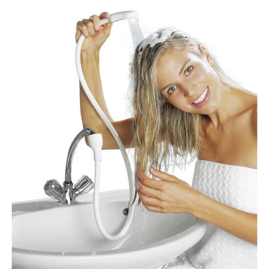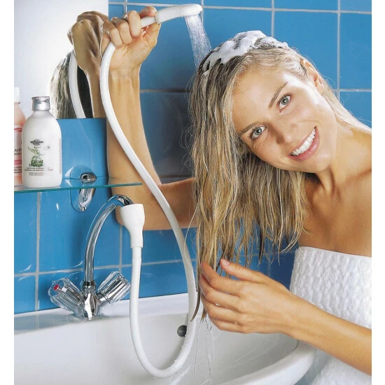 Die Mini-Dusche passt auf jedes handelsübliche Waschbecken und macht die Haarwäsche zu einem Kinderspiel in wenigen Minuten. Auch für unterwegs besonders gut geeignet.