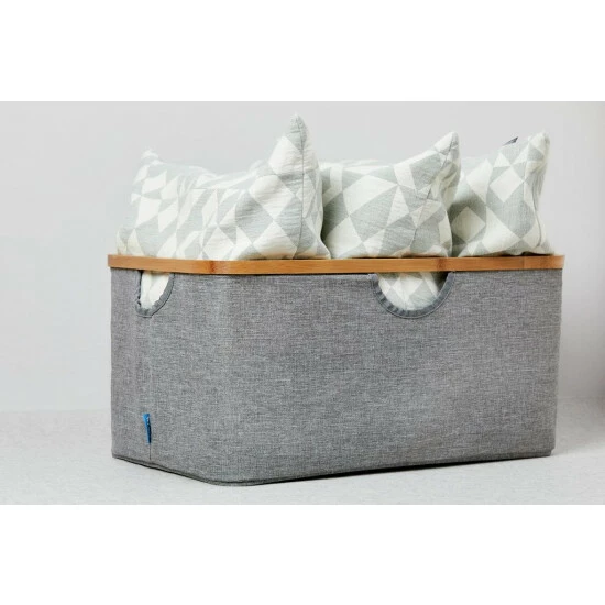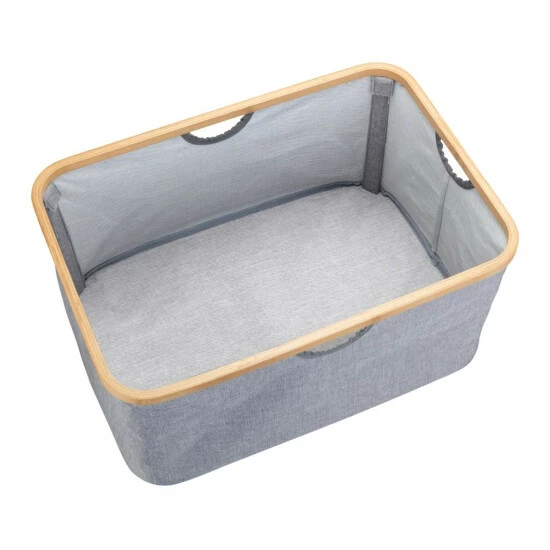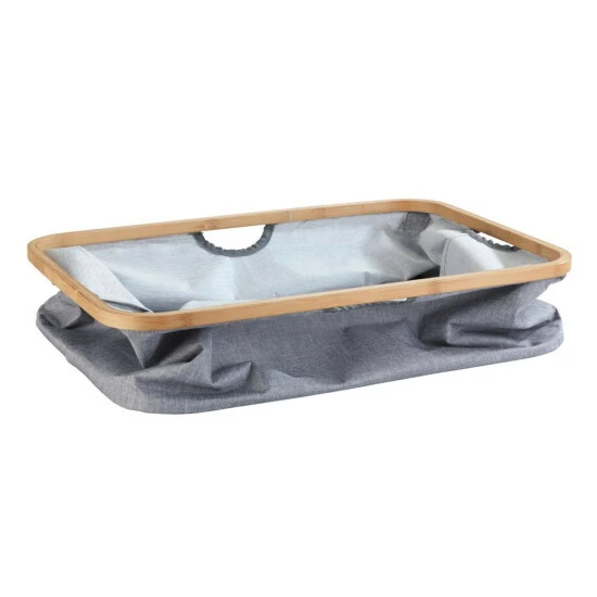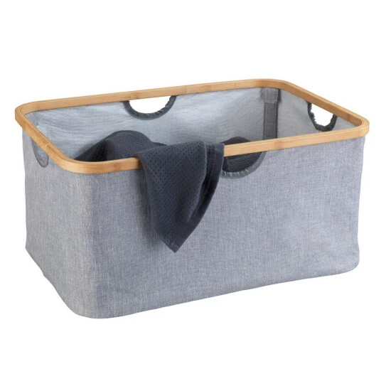 Der schöne, graue Wäschekorb besteht aus einem pflegeleichten Polyester. Der stilvolle Wäschesammler Bahari bietet mit seinen 50 Litern Fassungsvermögen jede Menge Platz für die Wäsche bis zum nächsten Waschgang. In seinem stabilen Bambus-Rahmen steht der Korb stets sicher und dekorativ an gewünschter Stelle. So macht der attraktive Wäschekorb im Badezimmer, Schlafzimmer und im Wäschekeller immer eine gute Figur. Bei Nichtgebrauch kann der Sammler zusammengefaltet und platzsparend aufbewahrt werden.